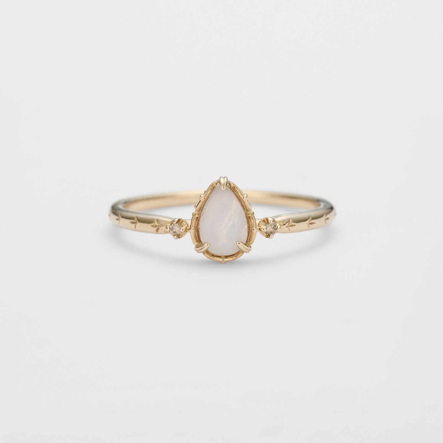 烟晶与绿松石贴合的双层宝石戒指。借由烟晶的贴合增添了绿松石蓝色的亮度、更加衬托肌肤。宝石底座与戒圈部分施予雕刻精致的植物图案、呈现复古风格。另外、将略带咖啡色韵味的钻石点缀于两侧更增添古董氛围。